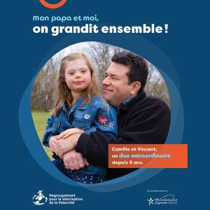 Réalisée en collaboration avec nos partenaires et inspirée des besoins exprimés par les organismes, cette série de six affiches met en valeur des duos de pères et d’enfant en situation de handicap. Un outil visuel qui reconnaît la place essentielle des pères et contribue à mieux faire connaître leur réalité.